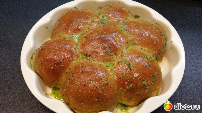 Пока булочки пекутся в блендере взбиваю соус: немного зелени по вкусу (у меня укроп), 3-4 зубчика чеснока, соль по вкусу, 3-4 столовые ложки масла растительного и столько же кипяченой холодной воды, этим соусом смазываю готовые булочки и даю настояться