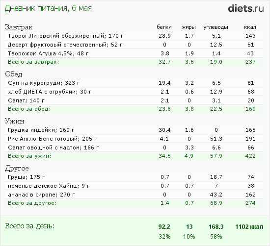 С калориями во вчерашнем дне у меня недобор. Обычно выходит к 1500 и жиров поболе. Не знаю, чего вчера так мало. Может из-за индейки (курица и рыба жирнее) и малого количества фруктов?
