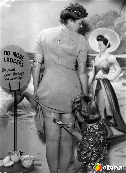 Нейлоновые чулки, которые так полюбились американкам в 1930-х, им пришлось в массовом порядке сдавать, чтобы военные могли делать из них парашюты. Ходить без чулок было неприлично. Чтобы имитировать на теле эту часть гардероба, дамы использовали тонирующие крема, которые прекрасно наносились именно на гладкие ножки.