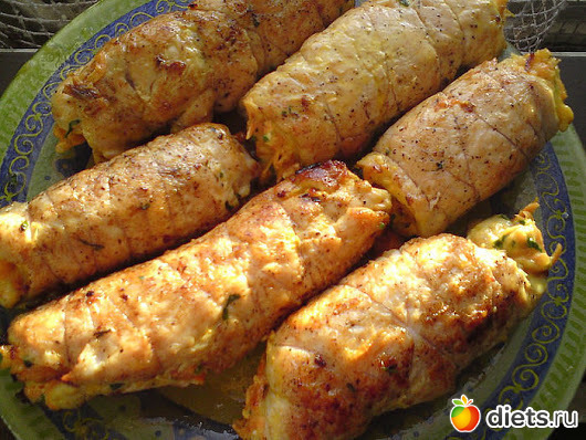 Начинку заворачивать в подготовленные пластинки курицы, закрепить зубочистками или нитками. Обжарить на растительном масле до золотистой корочки. Снять нитки. Уложить рулетики в сковороду или на противень, добавить немного воды или бульона и поставить в духовку на 30-40 минут.