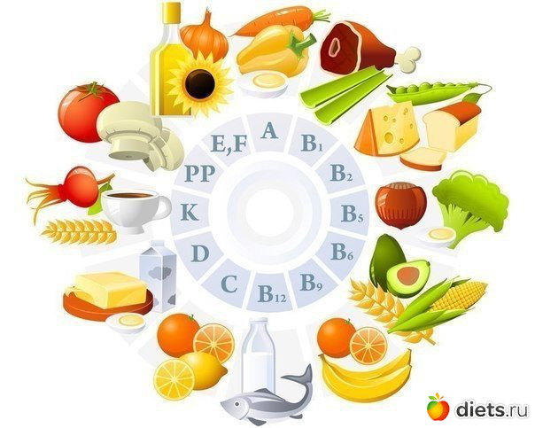 В6 - зеленые лиственные овощи, мясо, печень, рыба, молоко, яйца.