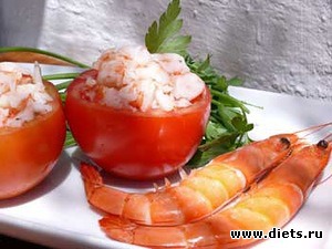 Небольшая изюминка в этом блюде: на дно каждого помидора положить по одной крупной маслине или впоследствии украсить сверху. Затем в помидоры с горочкой выложить полученную смесь из креветок и сельдерея. Сбрызнуть оливковым маслом и украсить листьями петрушки.