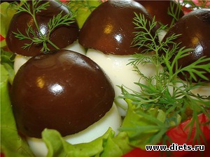 Сварить яйца вкрутую. Почистить и отрезать 1/3 от яйца для шляпки. Осторожно вынуть желтки и помять их вилкой с печенью, добавить мелко нарезаный лук, солить не надо т.к. печень достаточно соленая.