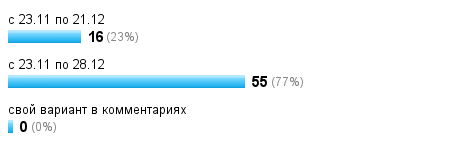 Можно оставить (как раньше) 5 недель, тогда дуэль будет с 23 ноября по 21 декабря. Оставшиеся дни до нового года, я думаю, не будет смысла начинать новую дуэль, и продолжение дуэлей будет в 2017 году.