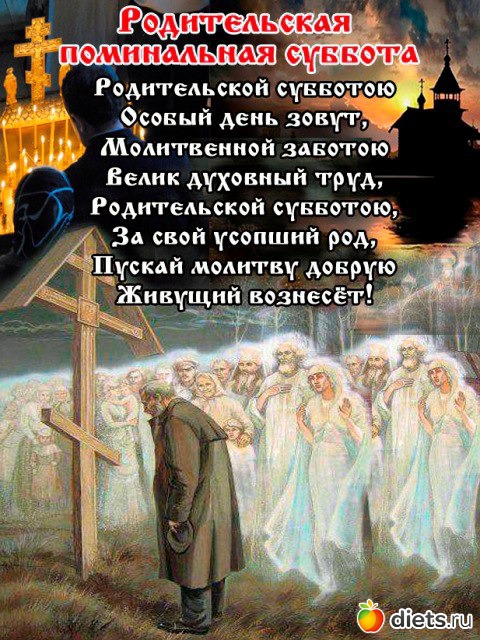 В этот день, как и в другие родительские дни (на мясопустную и Троицкую субботы, в субботы 2-й, 3-й и 4-й седмиц Великого поста), православные христиане молятся об упокоении душ почивших христиан, преимущественно родителей. Но Димитриевская суббота несет в себе еще особый смысл: установленная после Куликовской битвы, она напоминает нам обо всех тех, кто погиб, пострадал за православную веру.