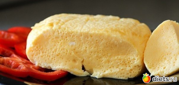 Через 30 минут омлет достаем, выворачиваем из мешочка (он не пристает к мешку)на тарелку, разрезаем и едим. Очень вкусно!