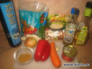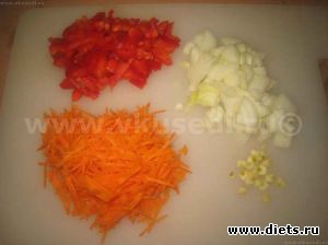 1. Морковь и лук почистить и вымыть. Разрежьте морковку вдоль, затем нарежьте длинными полосками. Разрежьте перец, удалите сердцевину и семена тоже полосками. Лук и чеснок порубите мелко.