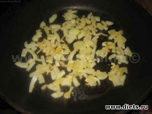 2. Прокалите на сковороде масло и прожарьте лук и чеснок в течение 5 минут, пока они не станут мягкими. Добавьте морковь и перец, подмешайте имбирь. Жарьте еще 1 минуту.
