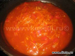 4. Остальной бульон влейте в сковороду и добавьте туда томатную пасту, сахар, уксус и рисовое вино или херес.