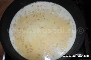 3. Добавляем вино и выпариваем на 2/3. Затем доливаем молока и шафран вместе с водой. Варим до загустения.