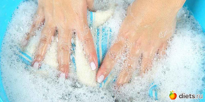 1. С вечера замочить шторы в теплой воде, утром постирать, затем положить в горячую воду с любым стиральным порошком.