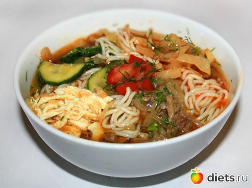 Основное -лапша (но обычно не рамен, а специальная лапша,но она тут продается),бульон(водоросли,суш анчоусы ,овощи) , овощи (и кимчи-квашенные с острым перцем и свежие и свежие чуть смешанные с острой пастой) и либо яичница глазунья,либо омлет лапшой порезанный.