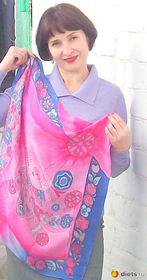 Платочки понравились все. Особенно первый (ты же знаешь мою любовь к цветочному принту) и третий (очень люблю сочетание серого и розового). Я тоже в Киеве заказывала одному мастеру такого типа расписные шарфики (батик). Даже заказывала ему - какие цвета хотела бы там увидеть. Они у меня здесь есть. Только вот почему-то не ношу
