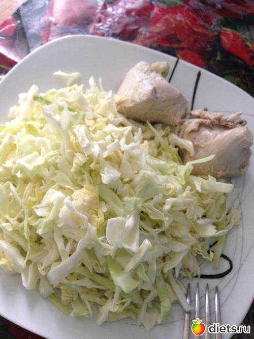 В обед сьела варенную курогрудь с салатом капустным с оливковым маслом так же как и вчера.