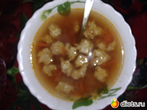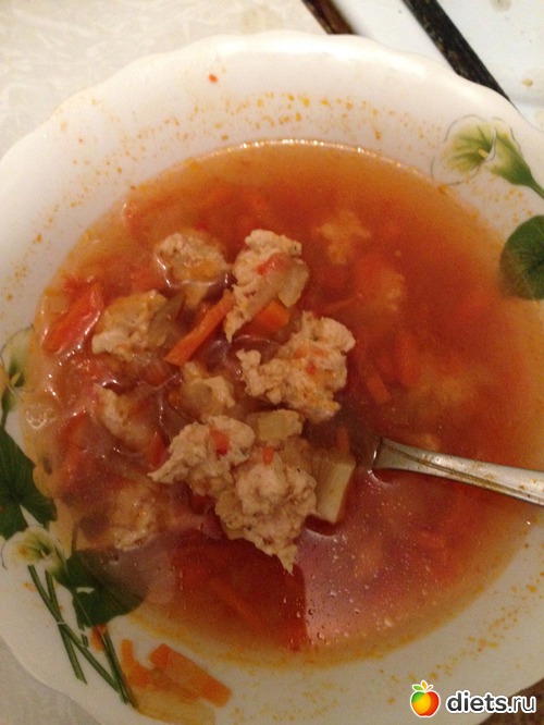 А затем свежесваренный суп с фрикадельками, сделала без картошки по этому думаю что не сильно калорийный.