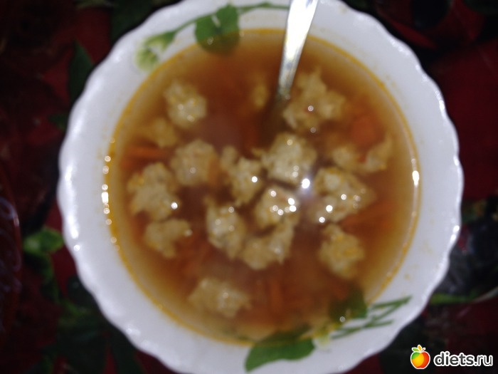А затем свежесваренный суп с фрикадельками, сделала без картошки по этому думаю что не сильно калорийный.
