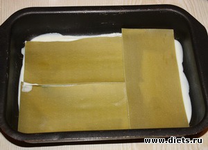 На дно формы наливаем немного соуса бешамель и равномерно распределяем его. Сверху кладем листы.
