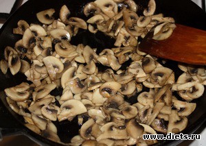 Шампиньоны нарезаем пластинками и обжариваем до мягкости на растительном масле (я использую оливковое).