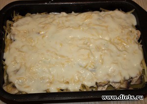 Повторяем дважды. Последний слой сыра и соуса накрываем листами для лазаньи, заливаем остатками соуса, посыпаем тертым пармезаном и ставим в разогретую до 200 градусов духовку на 40 минут.