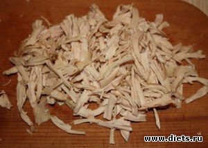 Курятину снимаем с кости и разбираем руками на волокна, не очень мелко.
