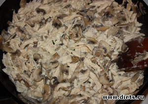 Добавляем к грибам курятину, жарим вместе еще пару минут, затем вливаем сливки или сметану, перемешиваем, держим до загустения и снимаем с огня.