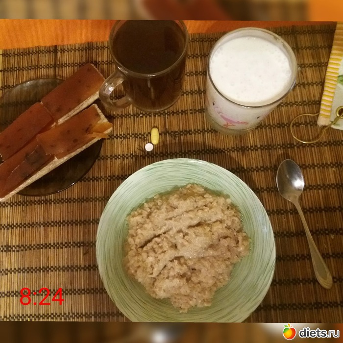 З: каша гречневая из хлопьев на молоководе, хлебцы с натур.мармеладом, кефир 3,2%+отруби, брусн.лист.