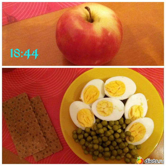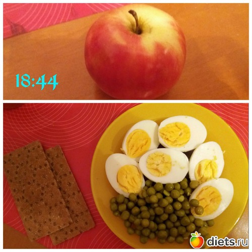 У: 3 яйца, зел.горошек, 2 хлебца, яблоко.