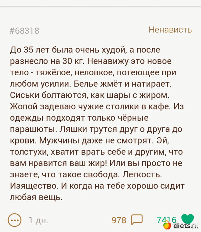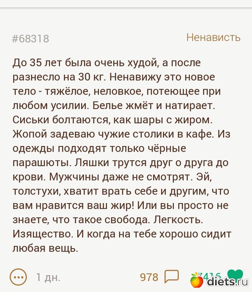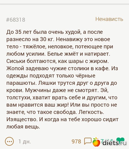 я эту запись тоже недавно читала в подслушано. даа... у меня вопрос сразу возник к себе и ко всем кто наел всё лишнее, о чем мы думали когда жрали, и почему не остановились на первых пяти кг....