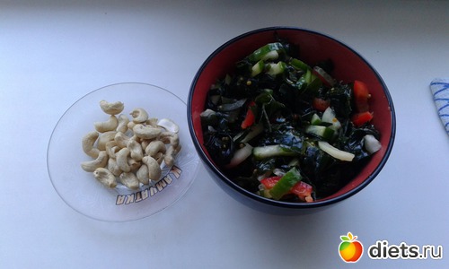 Обед: 50 грамм кешью и салат из морской капусты (морская капуста, лук, перчик, огурчик, французская горчица)