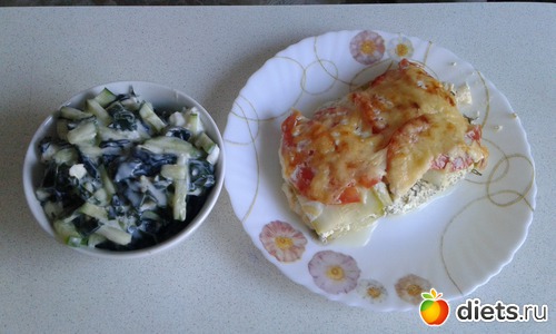 Обед: запеканка из кабачков и творога (на дно формы положила тонко нарезанные кабачки. На кабачки творог смешанный с зеленью и опять слой кабачков. И сверху натертый сыр) и салат из морской капусты (морская капуста, лук, огурец, и обежиренный йогурт).