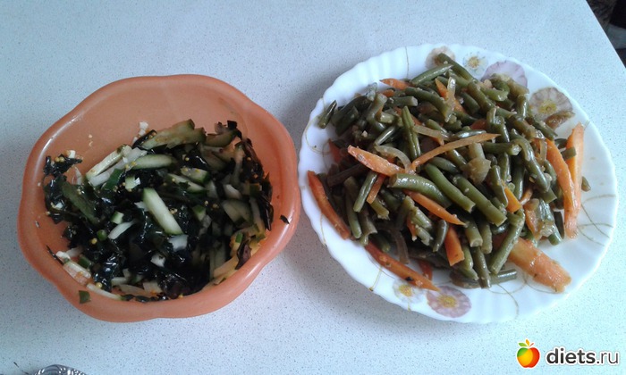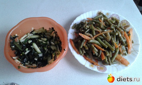 Обед: тушенная стручковая фасоль и салат из морской капусты (морская капуста, лук, огурец, и французская горчица)