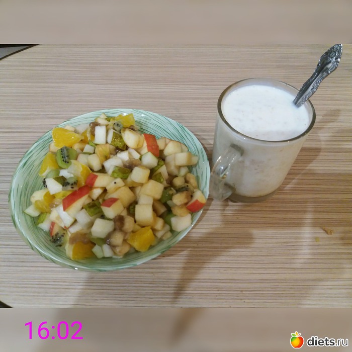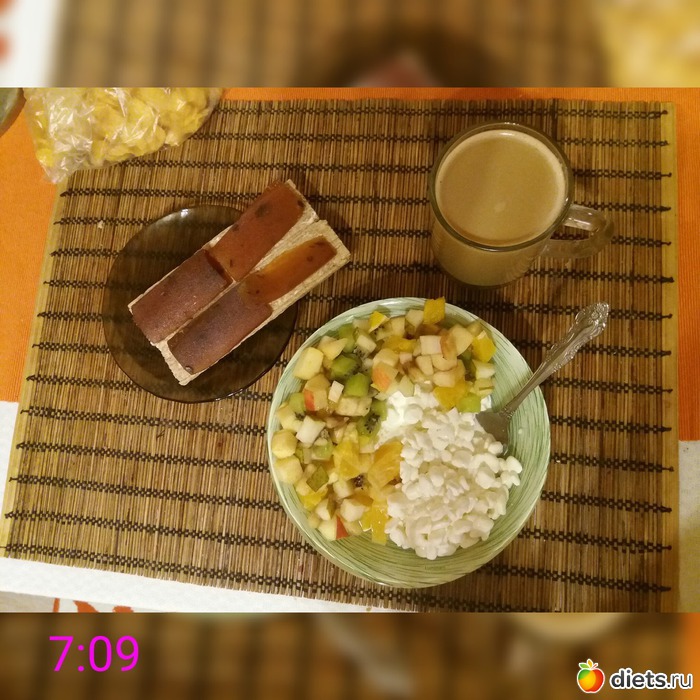 З: творог зернёный, фруктовый салат, хлебцы, натур.мармелад, цикорий с молоком.