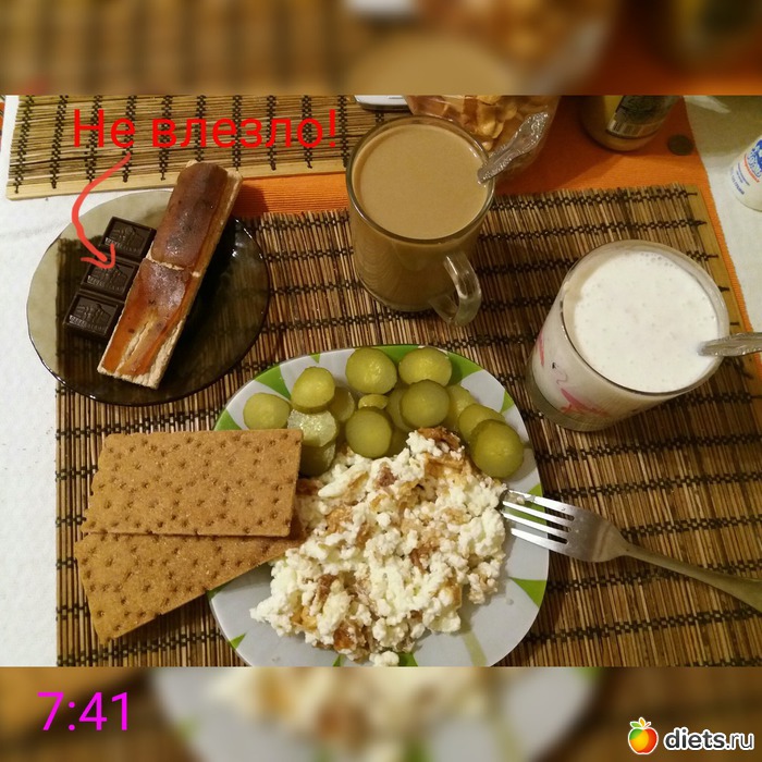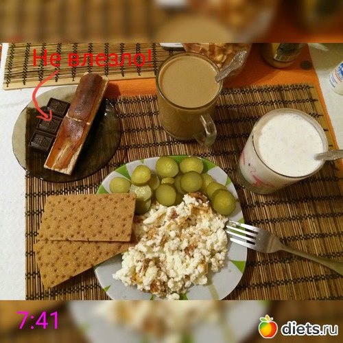 З: омлет из зерн.творога и белков, 2 греч.хлебца, сол.огурчик, хлебец с натур.мармеладом, цикорий с молоком, кефир 2.5 с отрубями. Кусочек шоколадки уже не влез