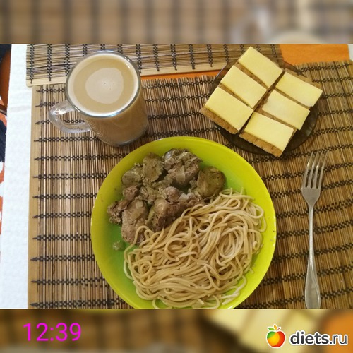 О: гречневые спагетти, куриная печень с сердцем, тушеные в молоке, гречневые хлебцы, 17% сыр, цикорий с молоком.