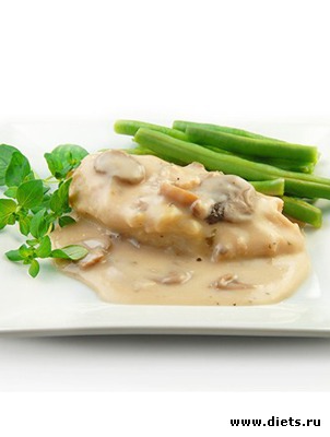 4. Готовую курочку вынимаем, а из луково-винной смеси делаем соус. Выкладываем на эту же сковороду мелко нарезанные шампиньоны, добавляем сметану, тушим до готовности. Получившимся соусом поливаем сверху кусочки курицы.