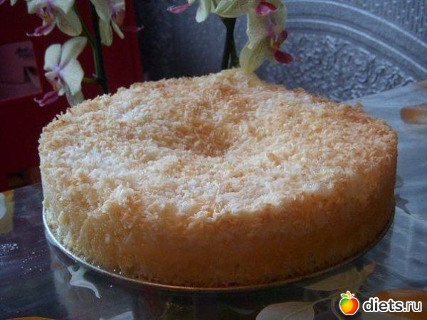 Поставить в нагретую духовку и выпекать при t 180-200 около 25-30 минут (зависит от духовки). Следите, чтобы не подгорела кокосовая стружка (минут через 10 с начала выпечки можно прикрыть пирог фольгой).