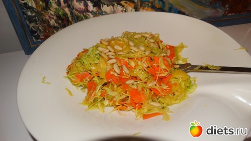 Полдник был:10 миндальных орехов и 1ст.л изюма;салат из капусты, моркови, ананаса, маринованного лука, с заправкой из соли, горчицы и оливк.масла.