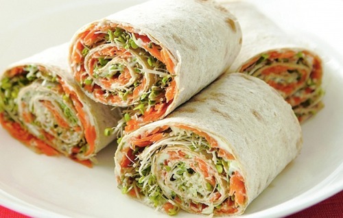 Лист лаваша хорошо разровнять по поверхности стола или разделочной доске. Смешать в отдельной чашке соленый обезжиренный творог и порезанную зелень, покрыть этим соусом лаваш. Следующим слоем должны стать овощи – они могут быть самыми разными: морковь, капуста, огурцы, перец…