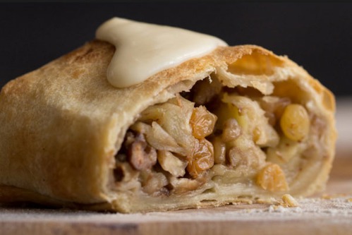 Перед тем, как отправить его в духовку, смазываем штрудель остатками яичной смеси. Выпекаем, пока не зарумянится.