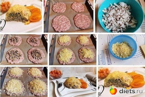 А на первом фото . Это что? Я поняла,что мясной фарщ +грибы+сыр и в духовку?