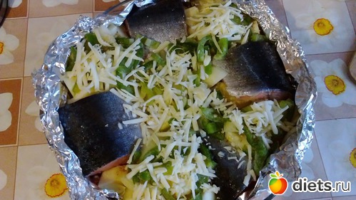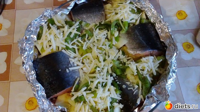Нарезала её как красную соленую рыбу пластинами-но потолще- немного отбивала, черный перец, сок лимона, соль на каждый кусок- обжаривала слегка почти на сухой сковородке и укладывала слоями-рыба-лук. Для семьи заливала раньше молоком с майонезом. А сейчас кефиром пробовала и тушить)))