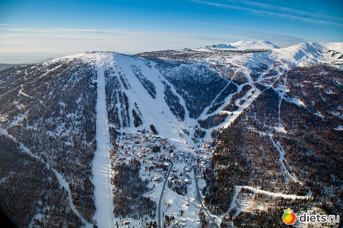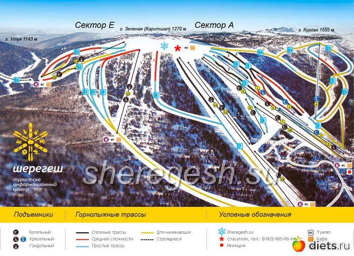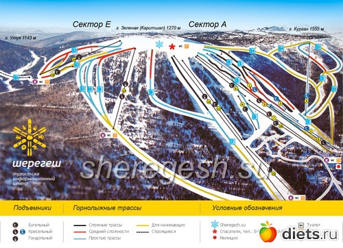 "Шерегеш — посёлок в Таштагольском районе Кемеровской области у подножия горы Зелёная.