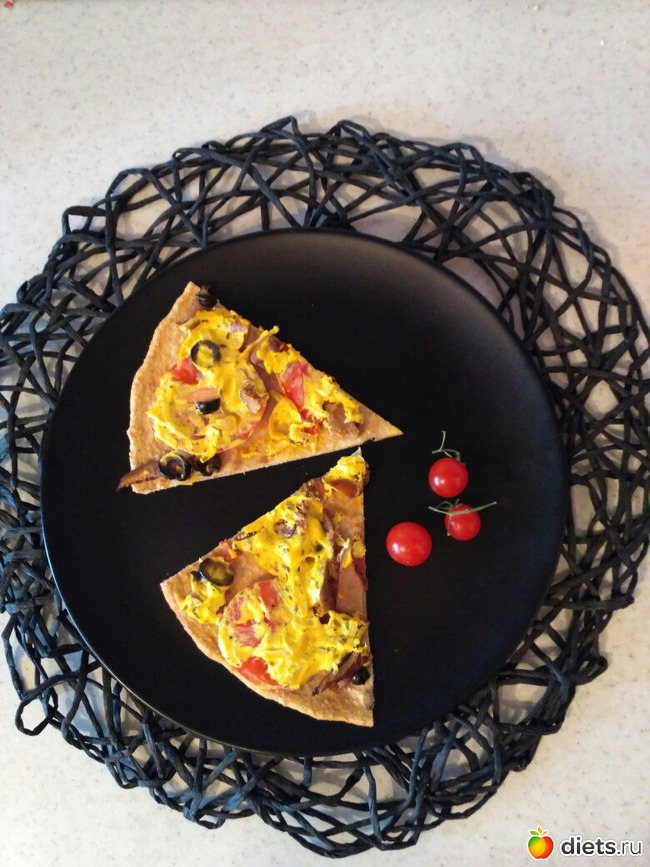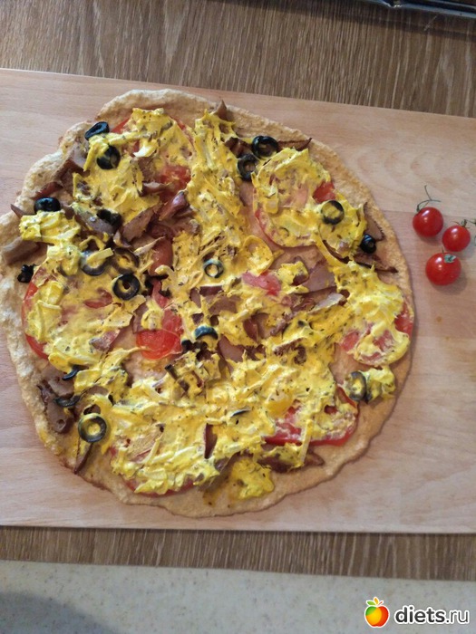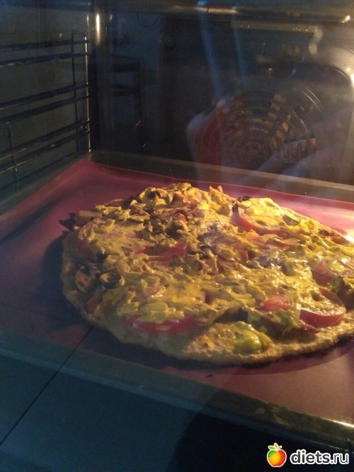 Делаем корж, выпекаем примерно минут 15. Достаем и раскладываем помидорки, грибы, маслины и все сверху смазываем соусом. В духовку еще на 15 мин. Все! Готово! Получилось вкусно)