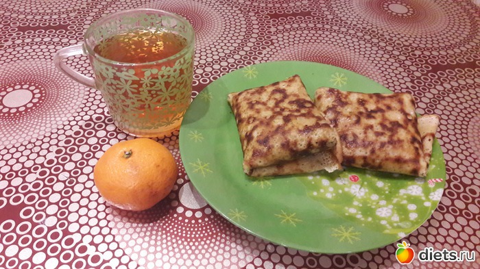 Завтрак - 2 блинчика с творожной начинкой (банан+творог+2ч.л. 15% сметаны) 200г + мандарин 51 г + чай. Всего: 251г... Читать полностью