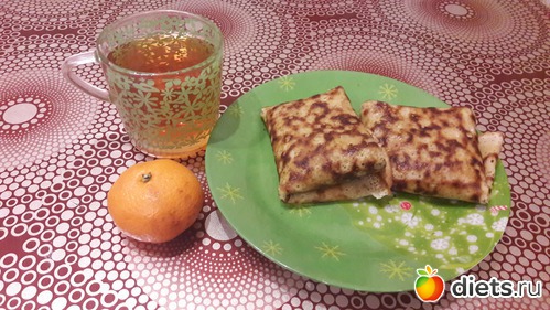 Завтрак - 2 блинчика с творожной начинкой (банан+творог+2ч.л. 15% сметаны) 200г + мандарин 51 г + чай. Всего: 251г