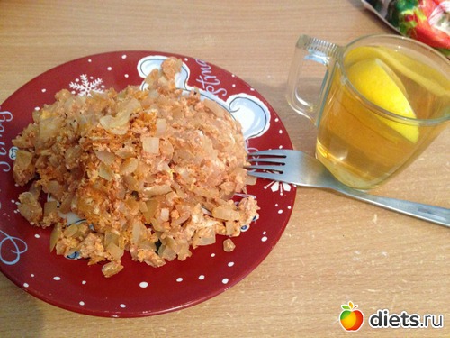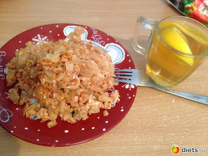 Обед: яичница с тоиатной пастой и луком+ чай с лимоном