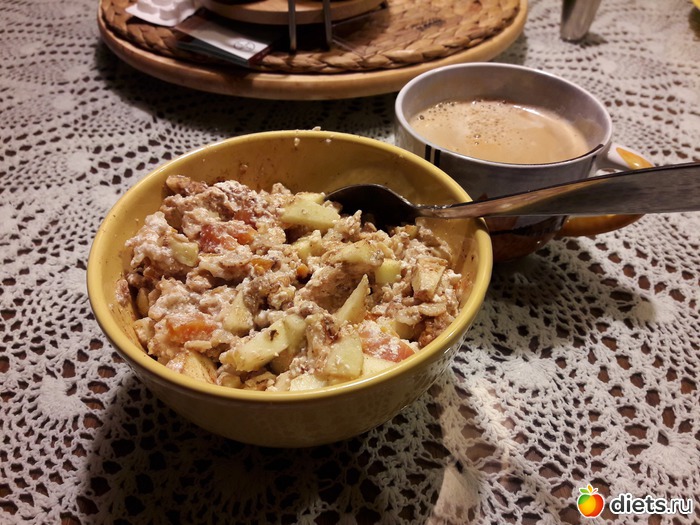 Поскольку утром не тренировалась, завтрак был чуть полегче: овсянка и льняные отруби, запаренные, с творогом, курагой, яблоком и грецким орехом.