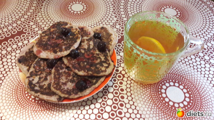 Завтрак - ягодные ПП-оладушки 142 г + 2 ч.л. вишневого варенья + чай