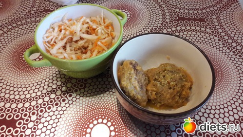 Обед - котлеты (говяжий фарш+ овощи) в соусе 170г + немного овощного салата