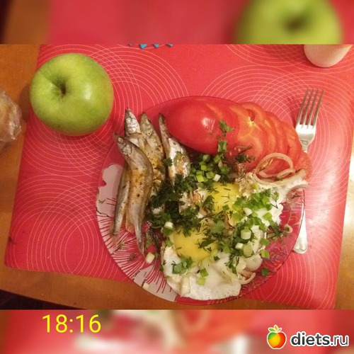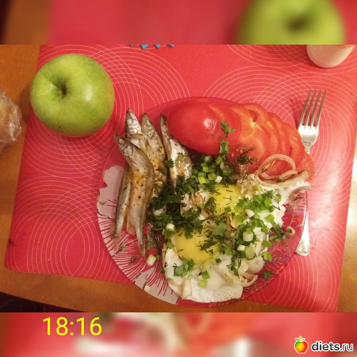 Яичница с луком, мойва, помидор и яблоко